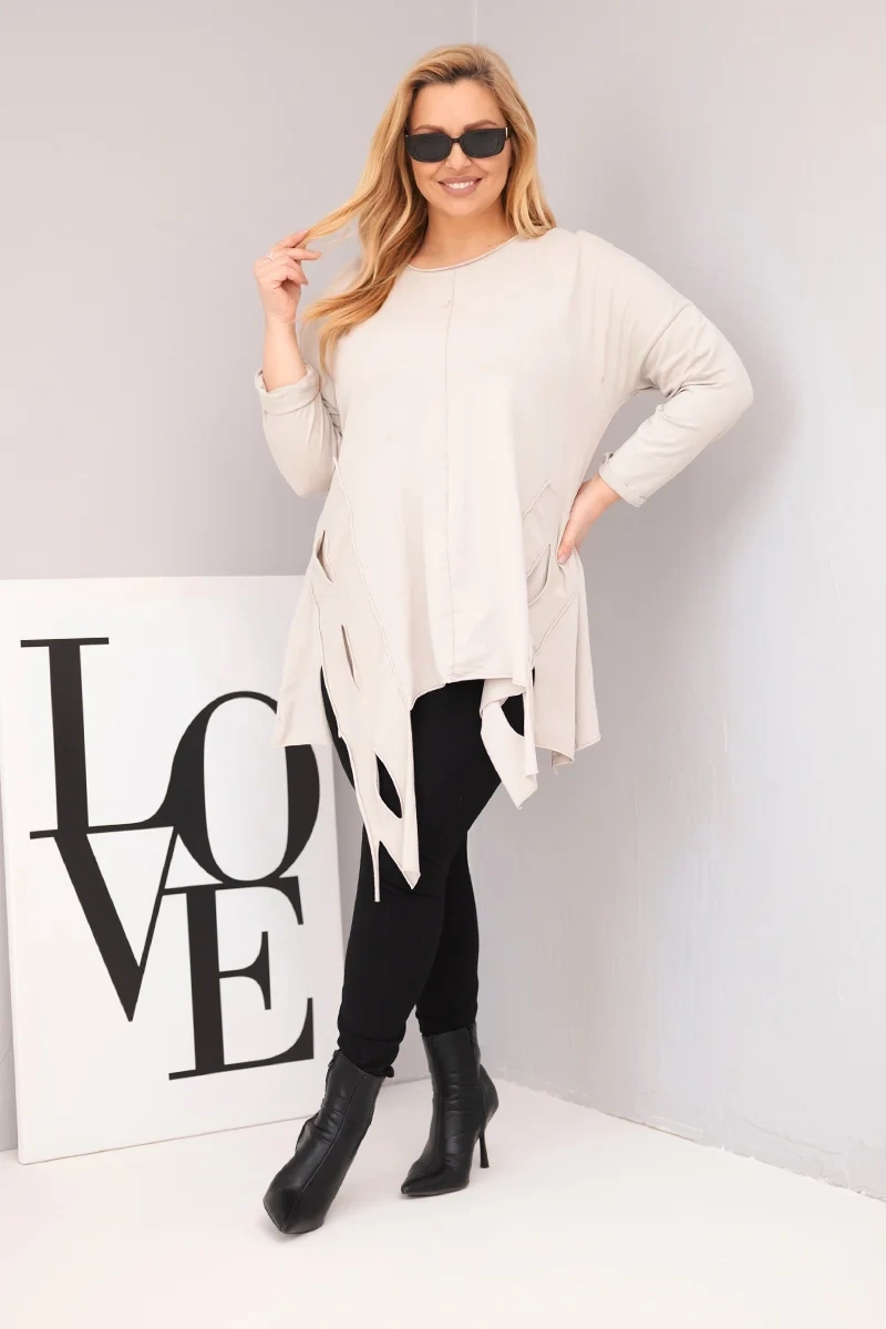 Szukasz wygodnej i oryginalnej bluzki, która wyróżni Twoją stylizację? Bluzka damska Plus Size z asymetrycznym dołem i dekoracyjnymi wycięciami to propozycja, która łączy komfort noszenia z nowoczesnym stylem. Dłuższy krój z przodu oraz fantazyjne cięcia nadają jej lekkości i niepowtarzalnego charakteru.