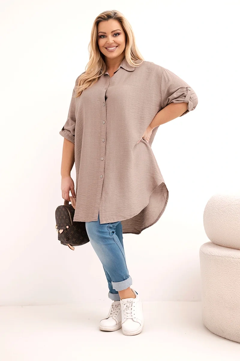 Ta wyjątkowa koszula damska oversize to połączenie swobodnego stylu i elegancji. Wykonana z lekkiej, przewiewnej wiskozy, doskonale sprawdzi się w cieplejsze dni, oferując maksymalny komfort noszenia. Luźny krój typu plus size gwarantuje wygodę, a wydłużony tył oraz rękawy 3/4 z możliwością podpięcia dodają nowoczesnego charakteru.